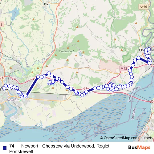 The first stop of the 74 bus route is Chepstow Bus Station Stand 1 and the last stop is Friars Walk 7. 74 (Newport - Chepstow via Underwood, Rogiet, Portskewett) is operational during everyday.
