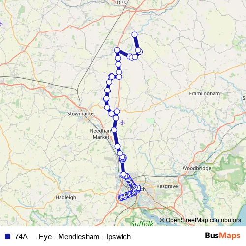 The first stop of the 74A bus route is Suffolk One and the last stop is Town Hall. 74A (Eye - Mendlesham - Ipswich) is operational during everyday.