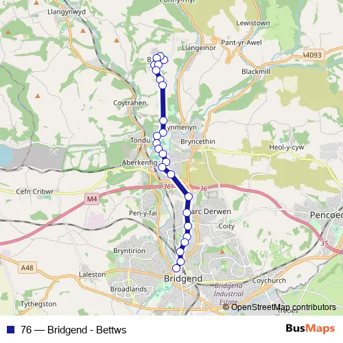 The first stop of the 76 bus route is Heol Glannant and the last stop is Bridgend Bus Station Stand 4. 76 (Bridgend - Bettws) is operational during everyday.