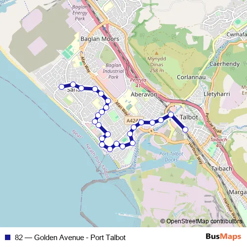 The first stop of the 82 bus route is Port Talbot Parkway Stand 2 and the last stop is Golden Avenue. 82 (Golden Avenue - Port Talbot) is operational during everyday.