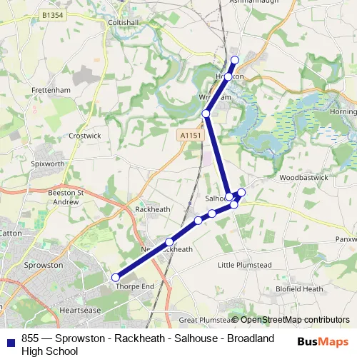 Red Admiral Way. 855 (Sprowston - Rackheath - Salhouse - Broadland High School) is operational during on weekdays.
