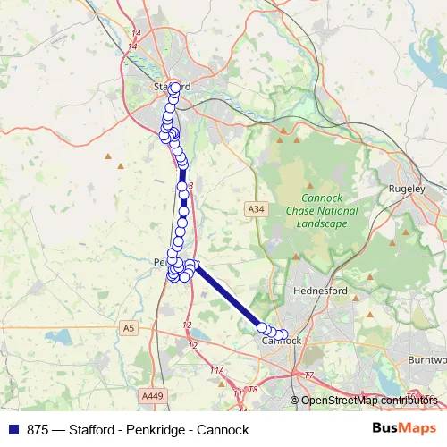 The first stop of the 875 bus route is Bus Station and the last stop is Cope Street. 875 (Stafford - Penkridge - Cannock) is operational during everyday.