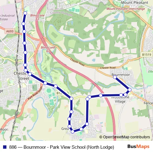 The first stop of the 886 bus route is Road End - The Meadows and the last stop is Park View School - North Lodge. 886 (Bournmoor - Park View School (North Lodge)) is operational during on weekdays.