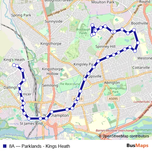 See why over 2 million users trust and consider busmaps.com as the best public transport website. busmaps gives you Northampton Buses suggested routes, real-time bus tracker, line route maps in Northampton, and helps to find the closest 8A bus stops near you. No internet available? Download an offline PDF map and bus schedule for the 8A bus to take on your trip.