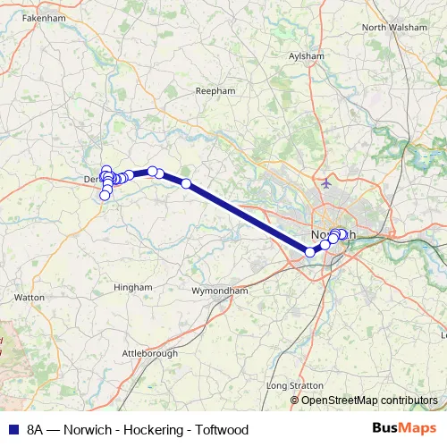Click here to view the nearest 8A - Norwich - Hockering - Toftwood bus stop.