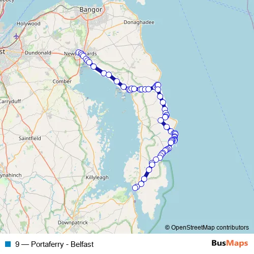 The first stop of the 9 bus route is Newtownards Bus Station and the last stop is Portaferry Square. 9 (Portaferry - Belfast) is operational during everyday.
