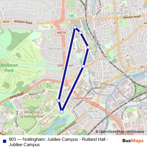 The first stop of the 903 bus route is Jubilee Campus and the last stop is Jubilee Campus. 903 (Nottingham: Jubilee Campus - Rutland Hall - Jubilee Campus) is operational during on weekdays.