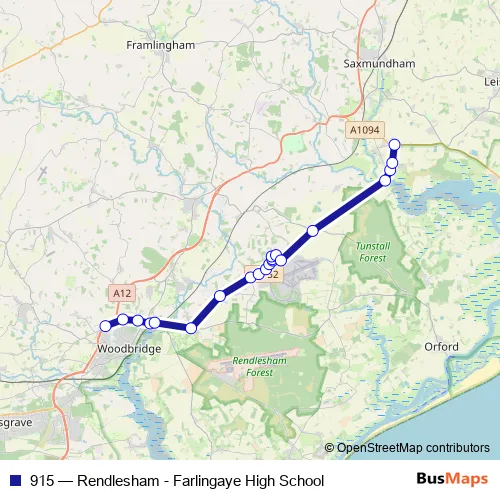 The first stop of the 915 bus route is Farlingaye School and the last stop is Church. 915 (Rendlesham - Farlingaye High School) is operational during on weekdays.