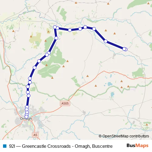 The first stop of the 92l bus route is Crossroads and the last stop is Omagh Bus Station. 92l (Greencastle Crossroads - Omagh, Buscentre) is operational during on weekdays.