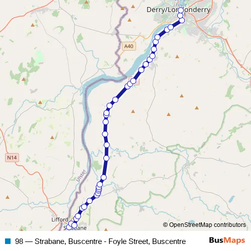 The first stop of the 98 bus route is Strabane Bus Station and the last stop is Foyle Street Bus Station. 98 (Strabane, Buscentre - Foyle Street, Buscentre) is operational during everyday.