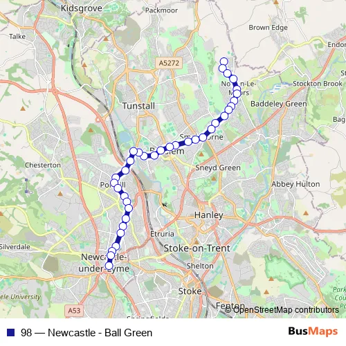 See why over 2 million users trust and consider busmaps.com as the best public transport website. busmaps gives you Stoke-on-Trent Buses suggested routes, real-time bus tracker, line route maps in Stoke-on-Trent, and helps to find the closest 98 bus stops near you. No internet available? Download an offline PDF map and bus schedule for the 98 bus to take on your trip.