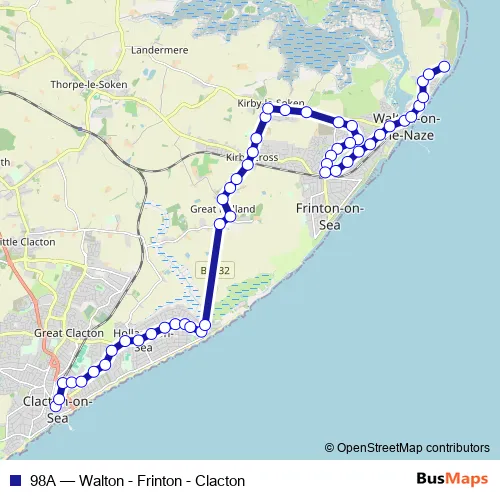 See why over 2 million users trust and consider busmaps.com as the best public transport website. busmaps gives you Walton-on-the-Naze Buses suggested routes, real-time bus tracker, line route maps in Walton-on-the-Naze, and helps to find the closest 98A bus stops near you. No internet available? Download an offline PDF map and bus schedule for the 98A bus to take on your trip.