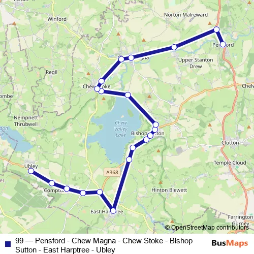 Click here to view the nearest 99 - Pensford - Chew Magna - Chew Stoke - Bishop Sutton - East Harptree - Ubley bus stop.