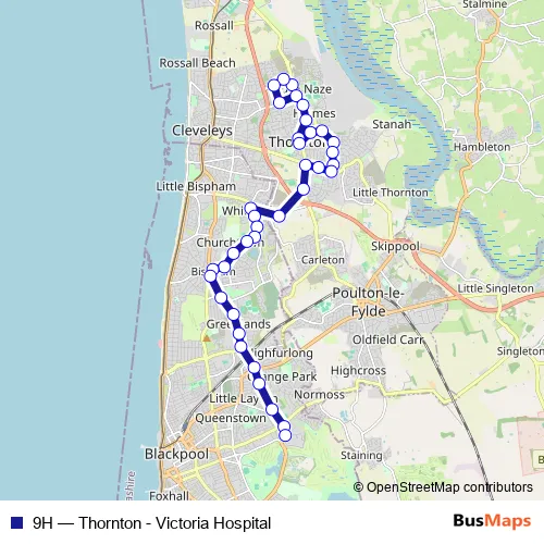 The first stop of the 9H bus route is Rippingale Way and the last stop is Victoria Hospital (To Blackpool). 9H (Thornton - Victoria Hospital) is operational during on weekdays.