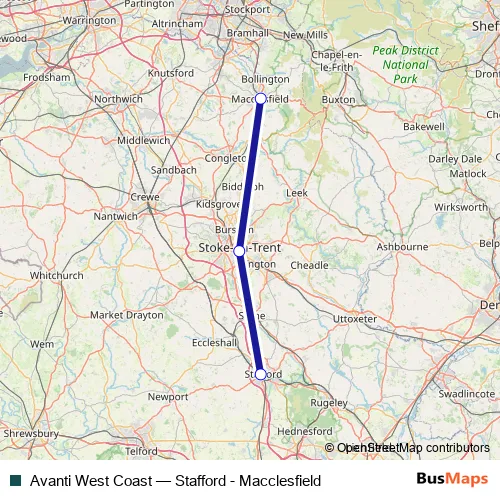 The first stop of the Avanti West Coast bus route is Stafford and the last stop is Macclesfield. Avanti West Coast (Stafford - Macclesfield) is operational during everyday.
