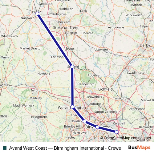 The first stop of the Avanti West Coast rail route is Birmingham International and the last stop is Crewe. Avanti West Coast (Birmingham International - Crewe) is operational during on weekends.