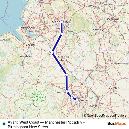 The first stop of the Avanti West Coast rail route is Manchester Piccadilly and the last stop is Birmingham New Street. Avanti West Coast (Manchester Piccadilly - Birmingham New Street) is operational during everyday.