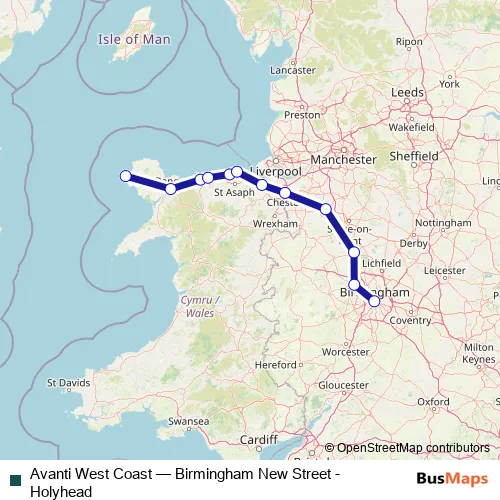 The first stop of the Avanti West Coast rail route is Holyhead and the last stop is Birmingham New Street. Avanti West Coast (Birmingham New Street - Holyhead) is operational during everyday.