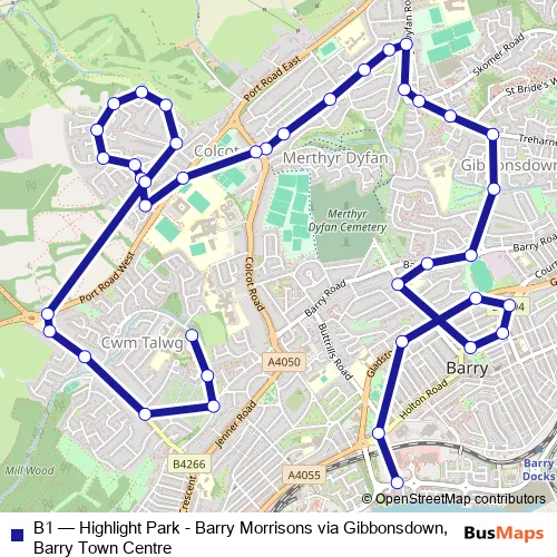 Click here to view the nearest B1 - Highlight Park - Barry Morrisons via Gibbonsdown, Barry Town Centre bus stop.