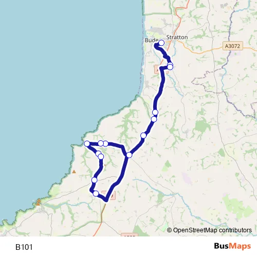 The first stop of the B101 bus route is Bude, Budehaven School and the last stop is Tregole, Dimma Chapel. B101 is operational during on weekdays.