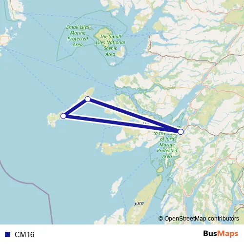 The first stop of the CM16 ferry route is Tiree Ferry Terminal and the last stop is Oban Ferry Terminal. CM16 is operational during everyday.