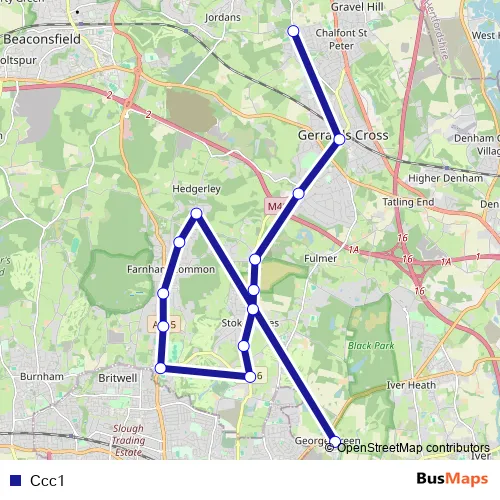 The first stop of the Ccc1 bus route is Chalfonts Community College and the last stop is