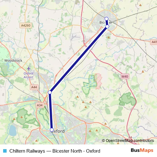 The first stop of the Chiltern Railways bus route is Bicester North and the last stop is Oxford. Chiltern Railways (Bicester North - Oxford) is operational during on weekends.