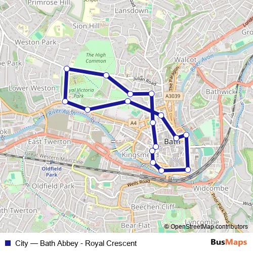 The first stop of the City bus route is Bath Abbey and the last stop is Bath Abbey. City (Bath Abbey - Royal Crescent) is operational during everyday.
