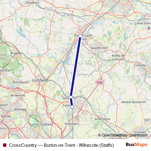 The first stop of the CrossCountry bus route is Burton-on-Trent and the last stop is Wilnecote (Staffs). CrossCountry (Burton-on-Trent - Wilnecote (Staffs)) is operational during on weekends.