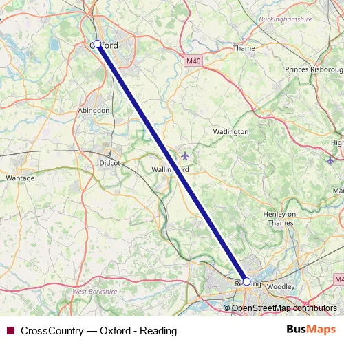The first stop of the CrossCountry rail route is Oxford and the last stop is Reading. CrossCountry (Oxford - Reading) is operational during everyday.