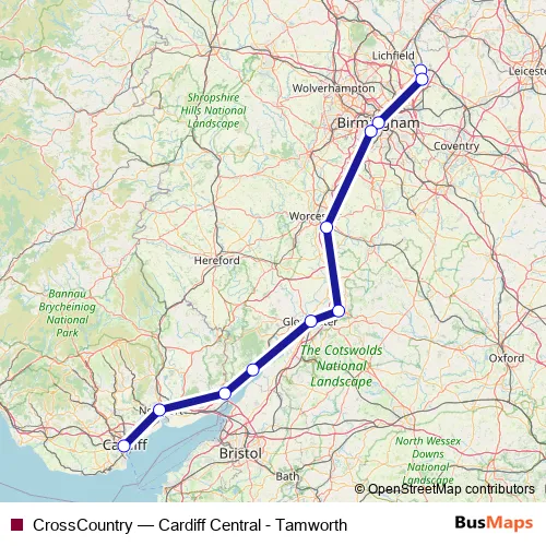 The first stop of the CrossCountry rail route is Tamworth and the last stop is Cardiff Central. CrossCountry (Cardiff Central - Tamworth) is operational during everyday.