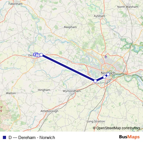 Click here to view the nearest D - Dereham - Norwich bus stop.