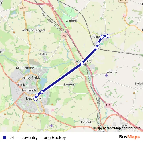 See why over 2 million users trust and consider busmaps.com as the best public transport website. busmaps gives you Long Buckby Buses suggested routes, real-time bus tracker, line route maps in Long Buckby, and helps to find the closest D4 bus stops near you. No internet available? Download an offline PDF map and bus schedule for the D4 bus to take on your trip.