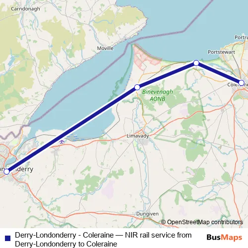 See why over 2 million users trust and consider busmaps.com as the best public transport website. busmaps gives you Coleraine Rail Services suggested routes, real-time bus tracker, line route maps in Coleraine, and helps to find the closest Derry-Londonderry - Coleraine rail stops near you. No internet available? Download an offline PDF map and bus schedule for the Derry-Londonderry - Coleraine rail to take on your trip.