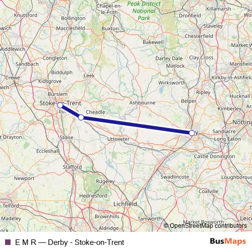 The first stop of the E M R rail route is Derby and the last stop is Stoke-on-Trent. E M R (Derby - Stoke-on-Trent) is operational during everyday.