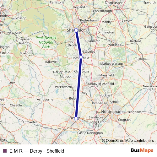 The first stop of the E M R bus route is Derby and the last stop is Sheffield. E M R (Derby - Sheffield) is operational during everyday.