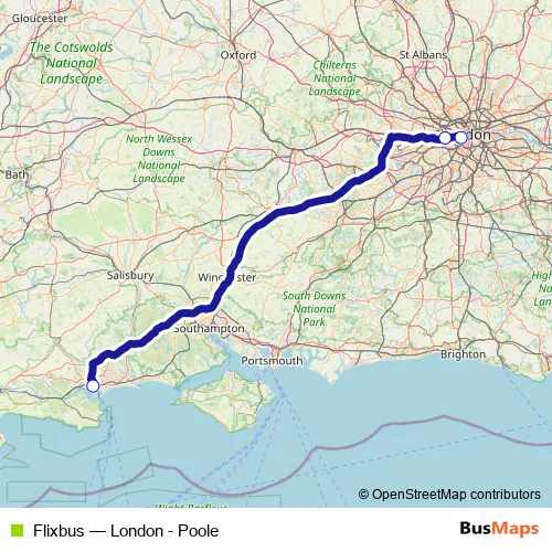 The first stop of the Flixbus bus route is Poole Dorset and the last stop is London Victoria Green Line Station. Flixbus (London - Poole) is operational during everyday.