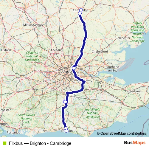 The first stop of the Flixbus bus route is Cambridge City Centre and the last stop is Brighton Old Steine Coach Station. Flixbus (Brighton - Cambridge) is operational during everyday.