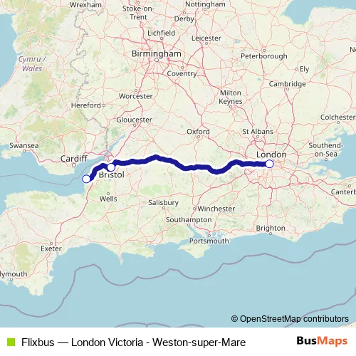 The first stop of the Flixbus bus route is London Victoria Coach Station and the last stop is Weston-super-Mare Interchange (stand B). Flixbus (London Victoria - Weston-super-Mare) is operational during everyday.