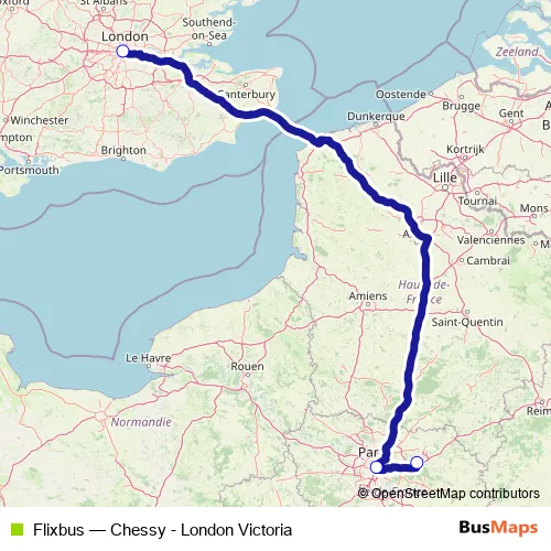 The first stop of the Flixbus bus route is London Victoria Coach Station and the last stop is Paris Chessy South Bus Station. Flixbus (Chessy - London Victoria) is operational during everyday.