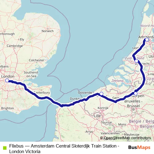 The first stop of the Flixbus bus route is London Victoria Coach Station and the last stop is Amsterdam Piarcoplein P+R Sloterdijk. Flixbus (Amsterdam Central Sloterdijk Train Station - London Victoria) is operational during everyday.