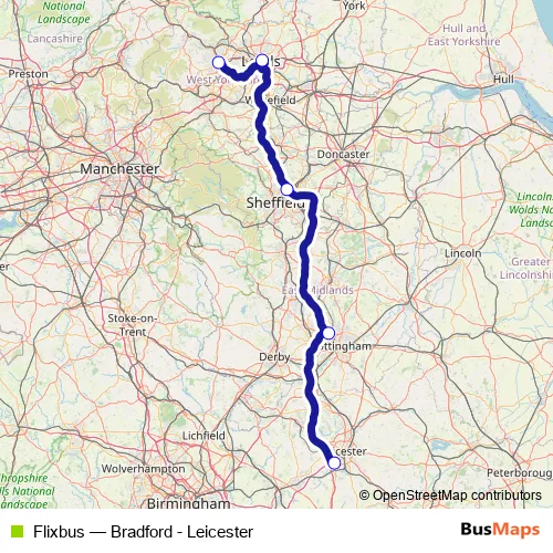 The first stop of the Flixbus bus route is Bradford Nelson Street and the last stop is Leicester Fosse Park. Flixbus (Bradford - Leicester) is operational during everyday.