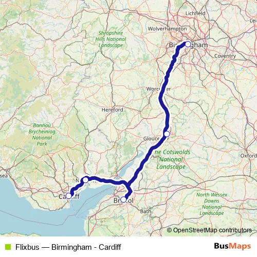 Click here to view the nearest Flixbus - Birmingham - Cardiff bus stop.