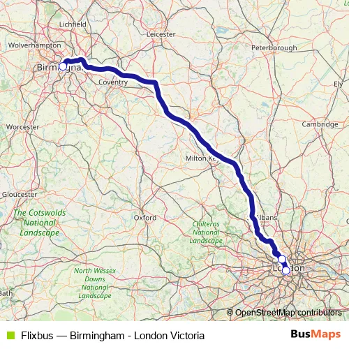 The first stop of the Flixbus bus route is London Victoria Coach Station and the last stop is Birmingham Great Charles Street Queensway. Flixbus (Birmingham - London Victoria) is operational during everyday.