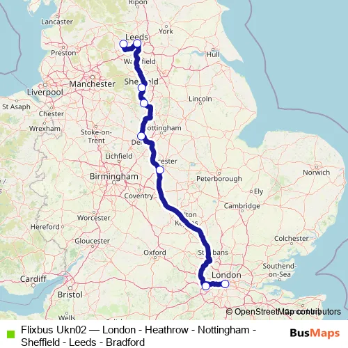 The first stop of the Flixbus Ukn02 bus route is London Victoria Coach Station and the last stop is 1 Bradford Nelson Street. Flixbus Ukn02 (London - Heathrow - Nottingham - Sheffield - Leeds - Bradford) is operational during everyday.