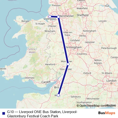 The first stop of the G10 bus route is Glastonbury Festival Coach Park and the last stop is Liverpool ONE Bus Station,Stand 1. G10 (Liverpool ONE Bus Station, Liverpool-Glastonbury Festival Coach Park) is operational during everyday.