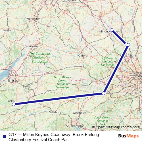 The first stop of the G17 bus route is Glastonbury Festival Coach Park and the last stop is Milton Keynes Coachway,Bay 4. G17 (Milton Keynes Coachway, Brook Furlong-Glastonbury Festival Coach Par) is operational during everyday.