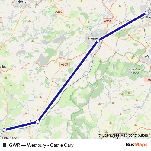 The first stop of the GWR rail route is Westbury and the last stop is Castle Cary. GWR (Westbury - Castle Cary) is operational during everyday.