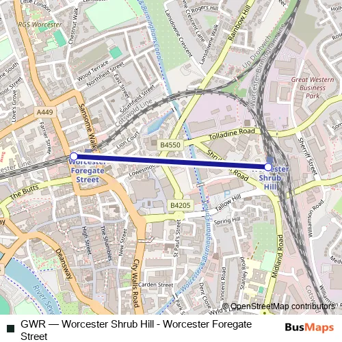 The first stop of the GWR rail route is Worcester Shrub Hill and the last stop is Worcester Foregate Street. GWR (Worcester Shrub Hill - Worcester Foregate Street) is operational during everyday.
