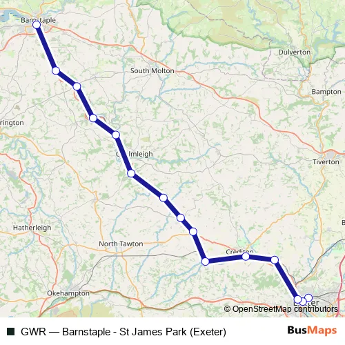 The first stop of the GWR rail route is St James Park (Exeter) and the last stop is Barnstaple. GWR (Barnstaple - St James Park (Exeter)) is operational during everyday.